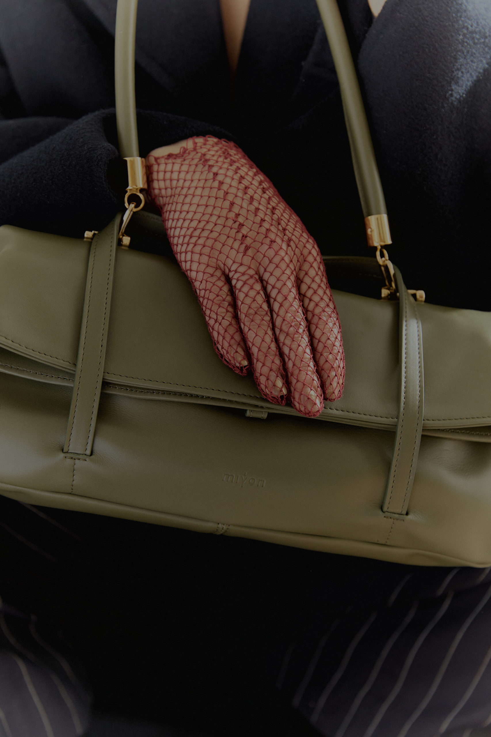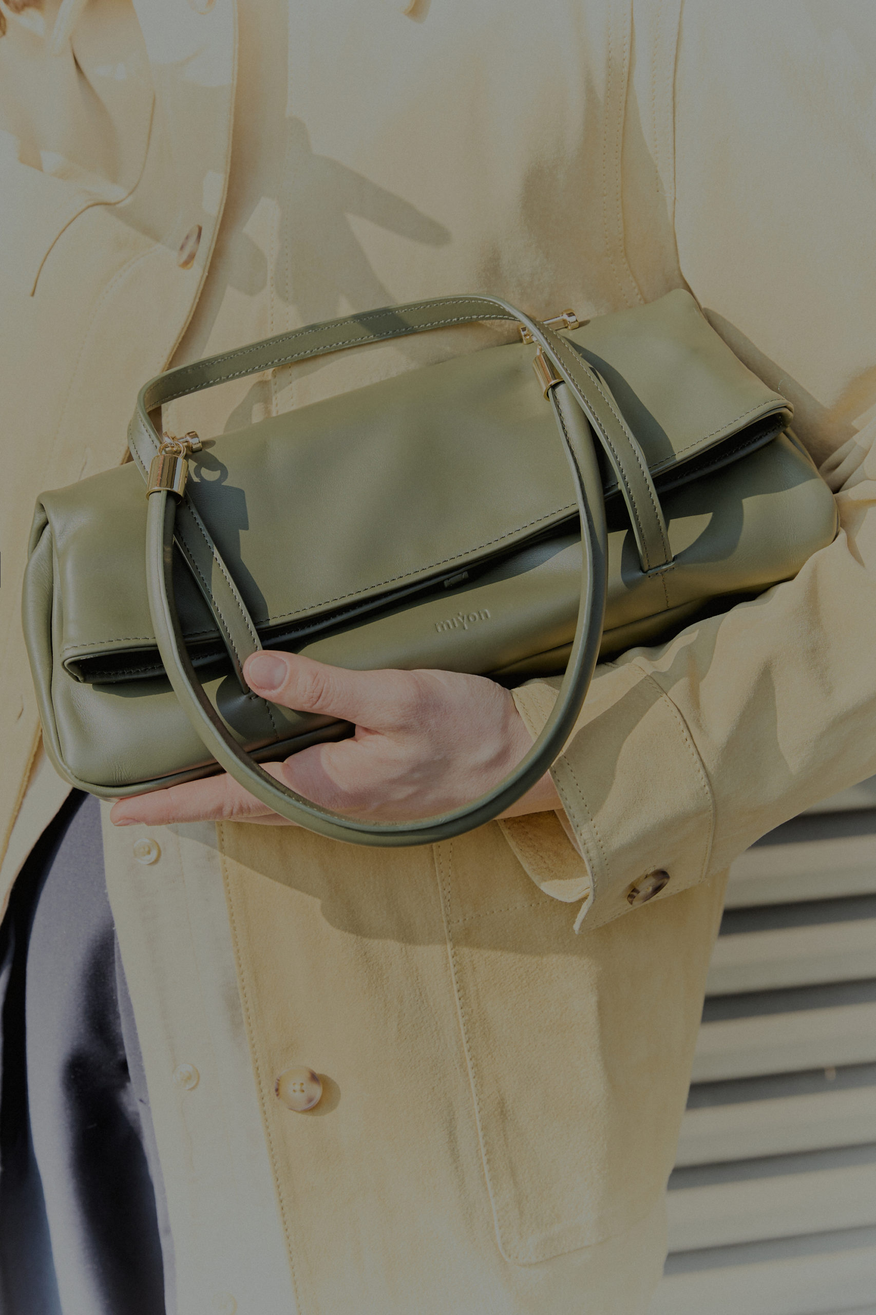 il dettaglio di chiusura tramite l’intreccio dei manici, permette la trasformazione, peculiarità del brand Miyon ‘Made in Venice’.