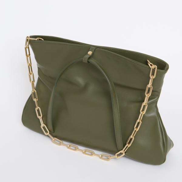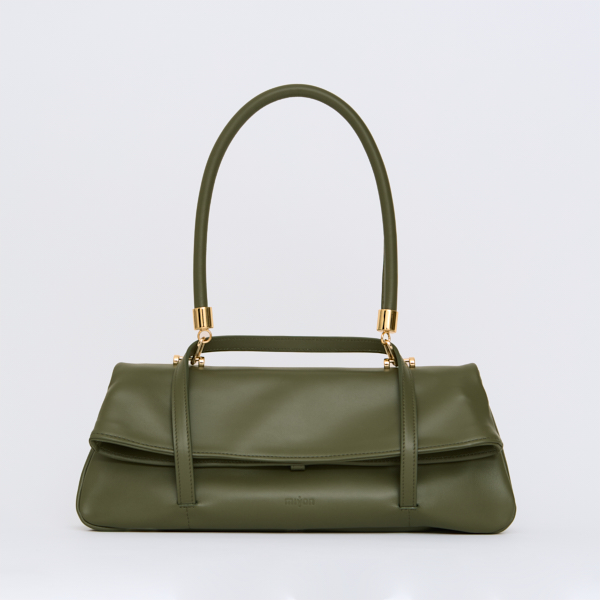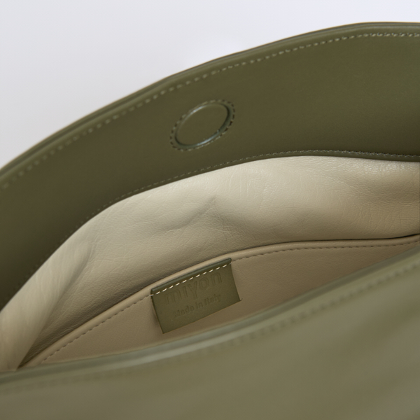 Per ottenere il meglio della sua capienza puoi indossarla aperta, con la sua riconoscibile forma ad anfora; chiusa è compatta ed essenziale nella forma, arricchita da elementi di minuteria metallica accuratamente selezionati.